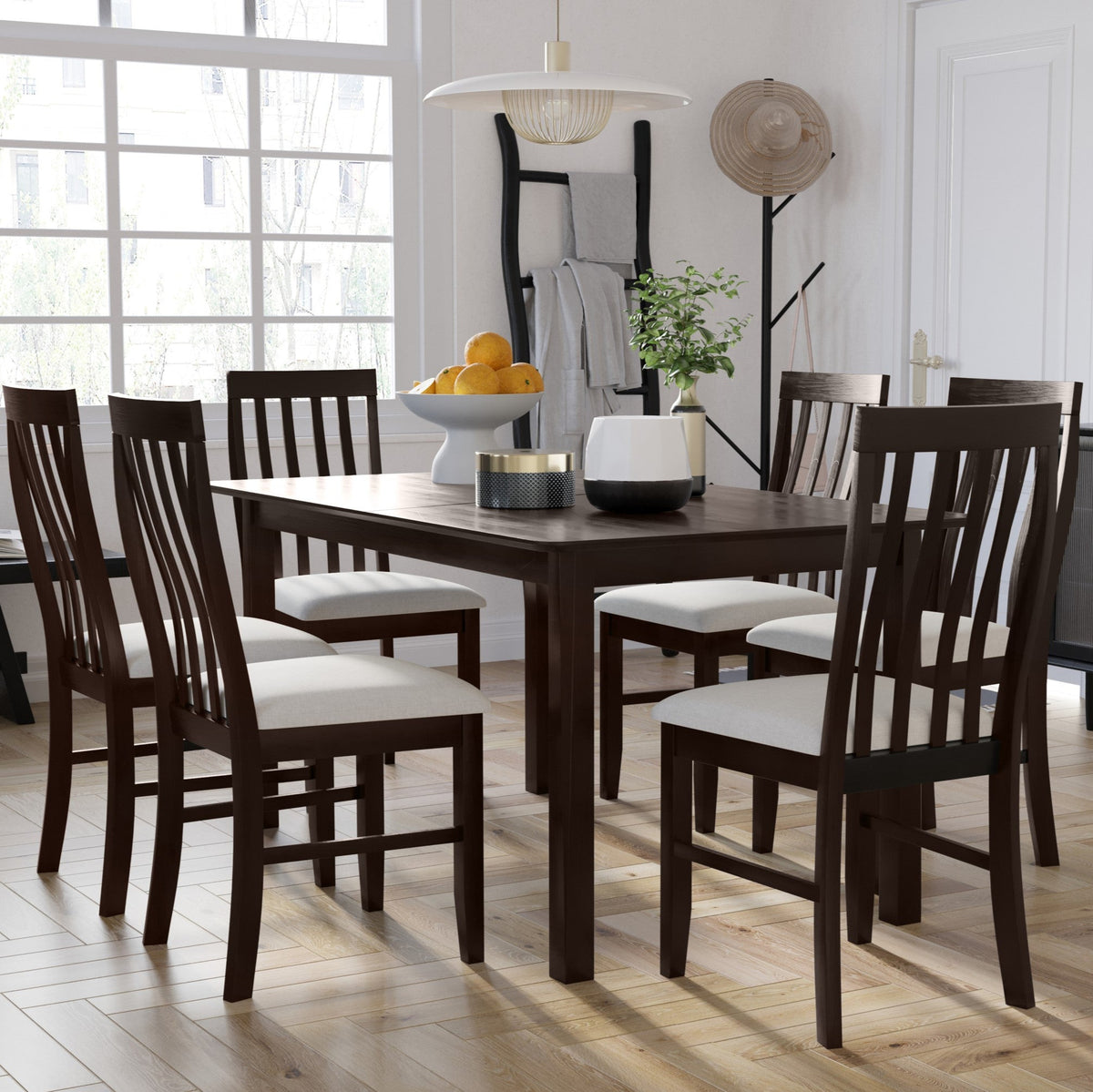 5-Piece Sanford Dining Set, Brown/Gray, Rectangular table, Middle-divided top, Slat-back cushioned chairs, Comfortable seating, Sturdy square legs, Modern style, Durable construction