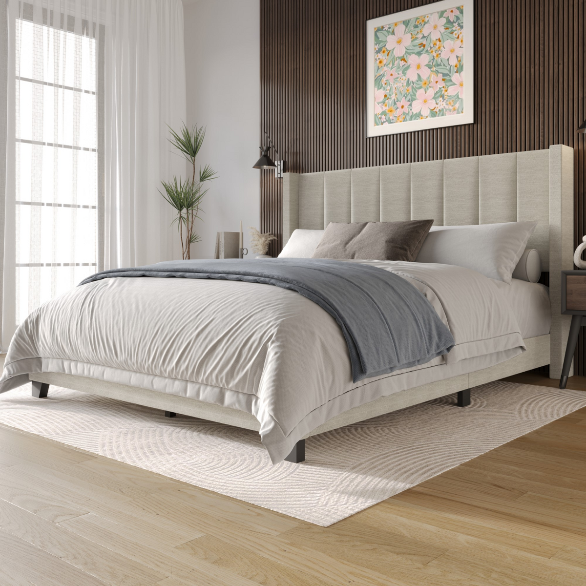 Odessa Twin Linen Upholstered Wingback Panel Bed Frame with Vertical Channel Tufting & Nailhead Trim, Gray, Easy Assembly
