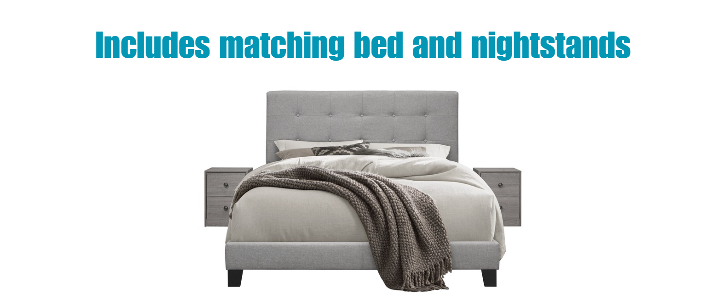 Sara Full Upholstered Panel Bed Frame with 2 Nightstands For Bedroom, Adult, Gray, Easy Assembly