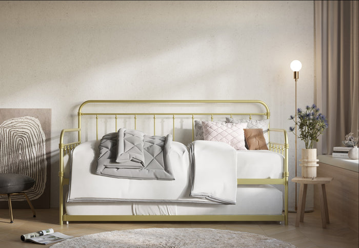 Aine Twin Metal Daybed with Pull-Out Trundle, Victorian-Style Frame, Rounded Finials, Durable Support, Stylish and Functional for Bedroom or Guest Room, Brown