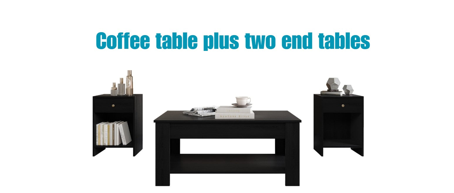 Add warmth and functionality to your living space with this Magnolia wood-finish coffee table sets, a perfect blend of natural charm and everyday practicality. Crafted in a rich brown and black color, this table features a sturdy rectangular build that bring a timeless look to any interior. Designed with a lift-up tabletop, it provides a convenient workspace or dining surface right from your couch, while offering hidden storage beneath. This set complete your space with 2 side end table that perfect blend of function and style. Each end table measures 15.6 inches in width and 11.7 inches for length, standing at 21.9 inches height. Compact and versatile, this piece works beautifully beside your sofa as a minimalist side table.