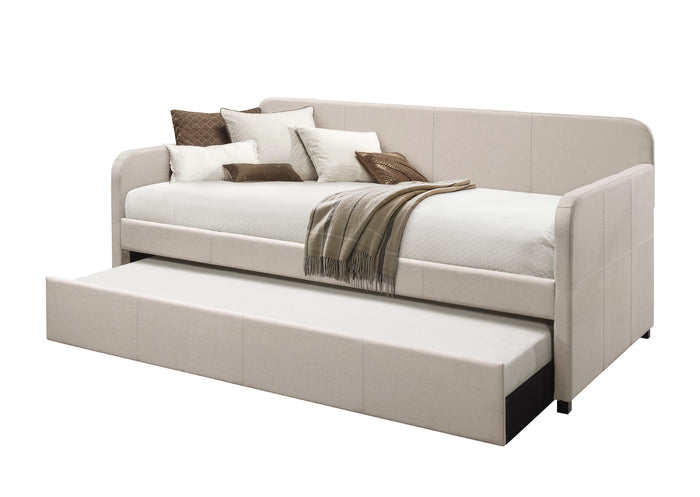 Amelia Twin Daybed with Linen Upholstery and Pull-Out Trundle, Track Arms, Rounded Backrest with Vertical Channel Tufting, Beige
