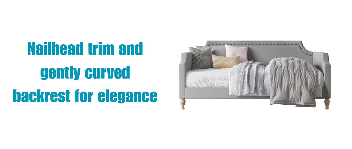 Pita Upholstered Twin Daybed with Nailhead Trim and Scooped Silhouette, Gray – Adult Living Room, Guest Room, or Bedroom, Easy Assembly