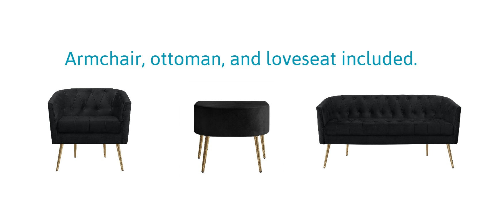 Transform your living room or reception space with the Cassy Velvet 4-Piece Set, designed to blend comfort, function, and modern style. This collection includes a tufted velvet armchair with a matching ottoman, a reception loveseat, and a spacious storage coffee table. The armchair is upholstered in plush velvet with a tufted backrest and seat, flared arms, and gold metal legs for a chic, contemporary look. A sturdy solid and engineered wood frame ensures lasting durability, while the ottoman provides the perfect spot to rest your feet or doubles as extra seating. The matching loveseat continues the luxurious velvet theme with a tufted backrest and seat, offering a cozy yet stylish spot to relax. Completing the set, the coffee table features a wide tabletop for remotes, magazines, or decorative pieces, supported by four sleek metal legs for stability and modern appeal. Together, this set delivers a balanced mix of comfort, storage, and sophistication, ideal for any living room or reception area.
