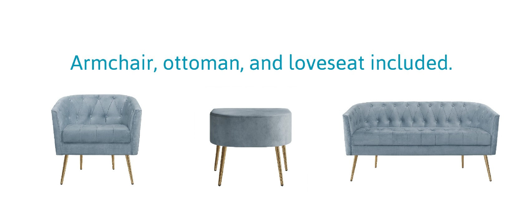 Transform your living room or reception space with the Cassy Velvet 4-Piece Set, designed to blend comfort, function, and modern style. This collection includes a tufted velvet armchair with a matching ottoman, a reception loveseat, and a spacious storage coffee table. The armchair is upholstered in plush velvet with a tufted backrest and seat, flared arms, and gold metal legs for a chic, contemporary look. A sturdy solid and engineered wood frame ensures lasting durability, while the ottoman provides the perfect spot to rest your feet or doubles as extra seating. The matching loveseat continues the luxurious velvet theme with a tufted backrest and seat, offering a cozy yet stylish spot to relax. Completing the set, the coffee table features a wide tabletop for remotes, magazines, or decorative pieces, supported by four sleek metal legs for stability and modern appeal. Together, this set delivers a balanced mix of comfort, storage, and sophistication, ideal for any living room or reception area.