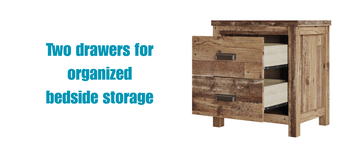 Upgrade your bedroom with this understated and clean-lined 2-drawer nightstand, designed to blend seamlessly with a variety of decor styles. The nightstand features a multi-toned finish with a woodgrain texture, bringing a rustic yet modern look that adds warmth and character to your space. The two spacious drawers provide ample storage for your books, magazines, and bedside essentials, helping you keep your space organized. The sturdy construction ensures durability, while the ample surface is ideal for placing a small lamp, a potted plant, or decorative accents.