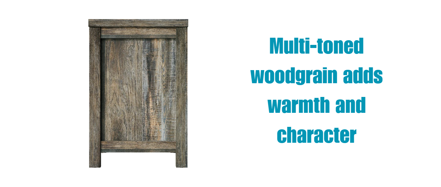 The drawers are accented with contemporary dark-toned handles, offering a clean, stylish contrast against the rustic wood finish for a balanced blend of old and new.