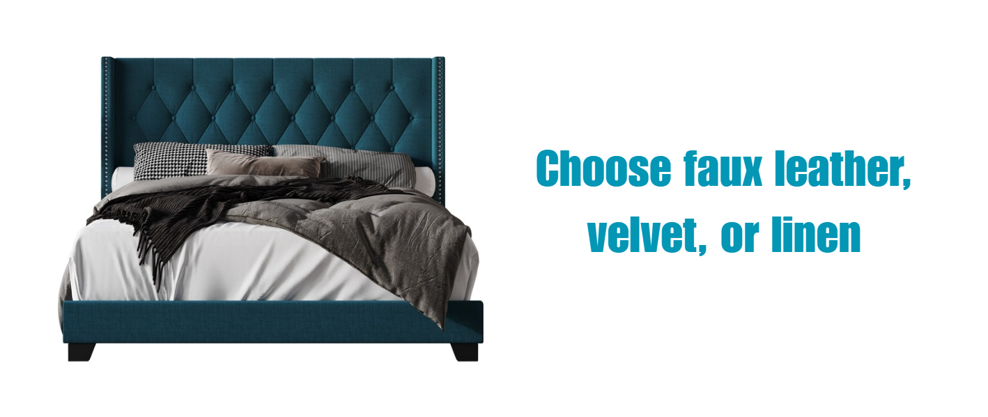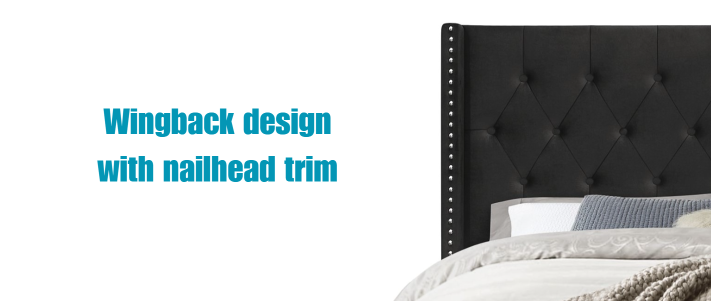 Elevate your bedroom with our tufted upholstered panel bed, where luxury and craftsmanship meet for a stunning focal point. The headboard is available in your choice of faux leather, velvet, or linen fabric, and showcases an elegant wingback design enhanced with sophisticated nailhead trim. The headboard also features a timeless button or diamond tufted design, adding a touch of classic charm to your space. Supported by sturdy wood legs, this bed promises both durability and style. This bed is complete when you add a box spring and mattress of your choice (sold separately).