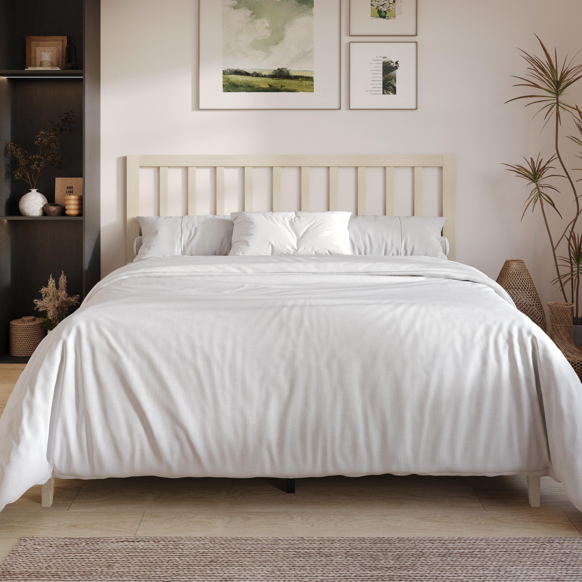 Create a bedroom that feels warm, inviting, and effortlessly stylish with this bed frame. Designed with a timeless slatted headboard and clean architectural lines, this bed frame blends classic craftsmanship with modern simplicity—making it a versatile centerpiece for any bedroom setting. Expertly crafted from solid wood and reinforced with durable LVL slats, this bed frame delivers dependable mattress support without the need for a box spring. The sturdy platform construction ensures long-lasting stability while maintaining a sleek, low-profile silhouette.