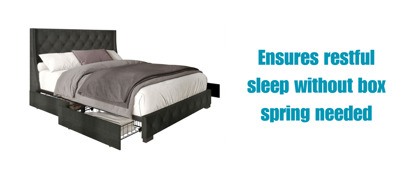 Our metal storage platform bed is a perfect combination of modern style and practicality to enhance your bedroom decor. This bed comes with four spacious drawers for providing ample storage space. Designed with a full slat to ensure optimal support and comfort, this bed guarantees a sound sleep without a box spring mattress. This bed are available in Full, Queen and King sizes.